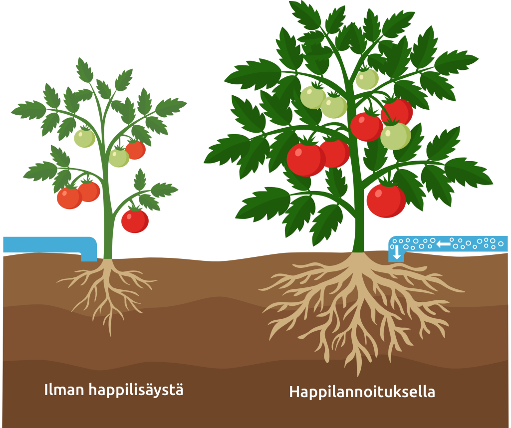 Happea tarvitaan monien kasville elintärkeiden fysiologisten prosessien käynnistymisessä, minkä vuoksi juuriston alhaista happipitoisuutta voidaan pitää kasvua rajoittavana tekijänä. Hapen määrä kasvualustassa määrittää sen, mihin suuntaan juuret kasvavat ja miten niiden aineenvaihdunta toimii. Riittämätön happipitoisuus vähentää kasvien veden kulutusta, hidastaa niiden kasvua, heikentää satoisuutta, ja aiheuttaa lakastumista. Myös esimerkiksi ylikastelun aiheuttaman kasvien vioittumisen tai kuoleman on…